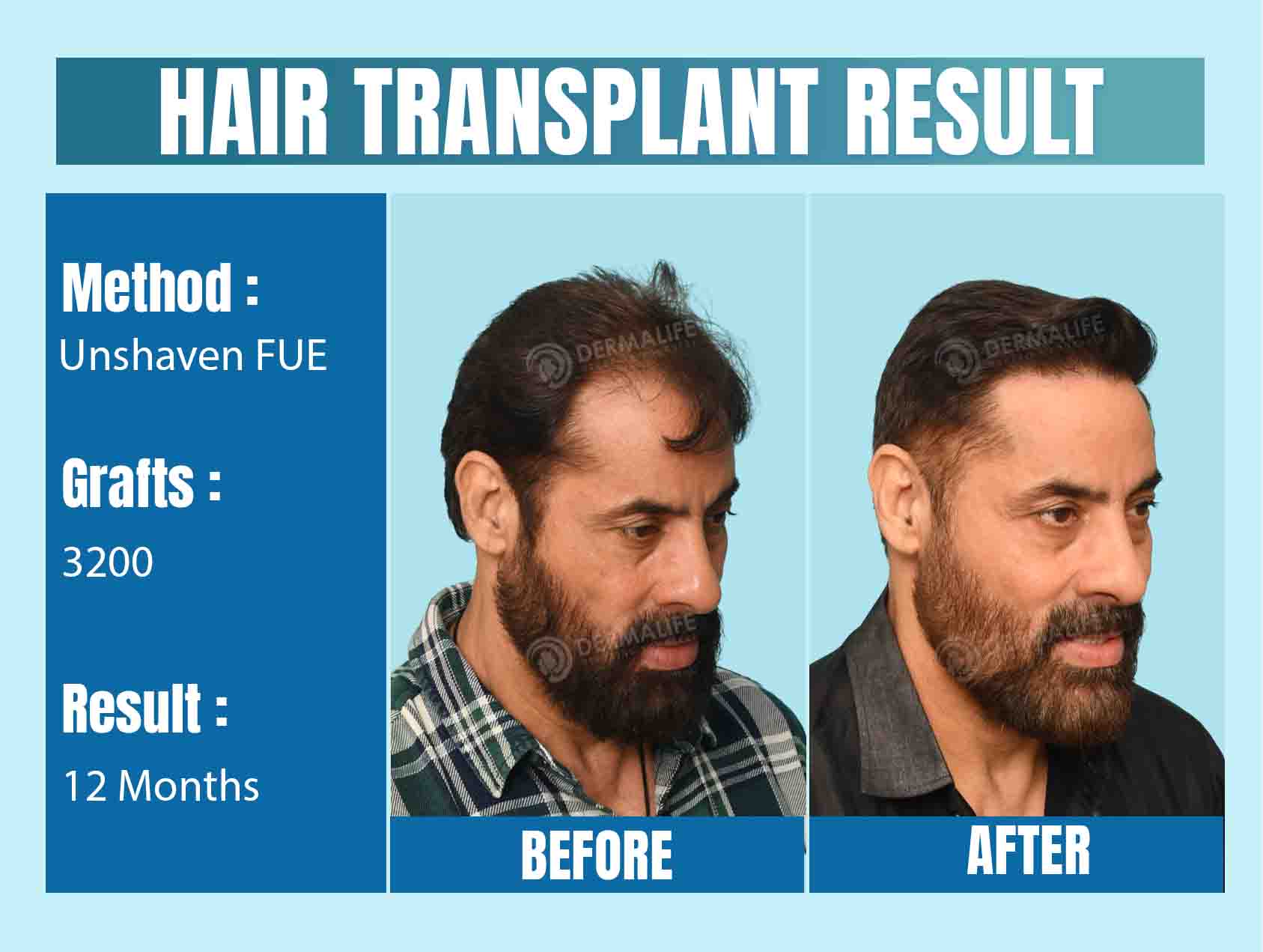 As you can see in the picture, Shaji has very little hair in the temple area. He is suffering from baldness, Norwood Scale 3. In this stage, you experience hair loss in the frontal part of the scalp. It is universally accepted that if you do not do a hair transplant at the crown, then a man is likely to lose more hair in the future. Once his hair loss scale was determined, Dr. Garg, the best celebrity hair transplant surgeon in India, suggested that he would need 3200 grafts for a successful hair transplant. Also, since Dermalife is a master in unshaven FUE hair transplant, Shaji Chaudhary suggested the same technique for hair transplant.